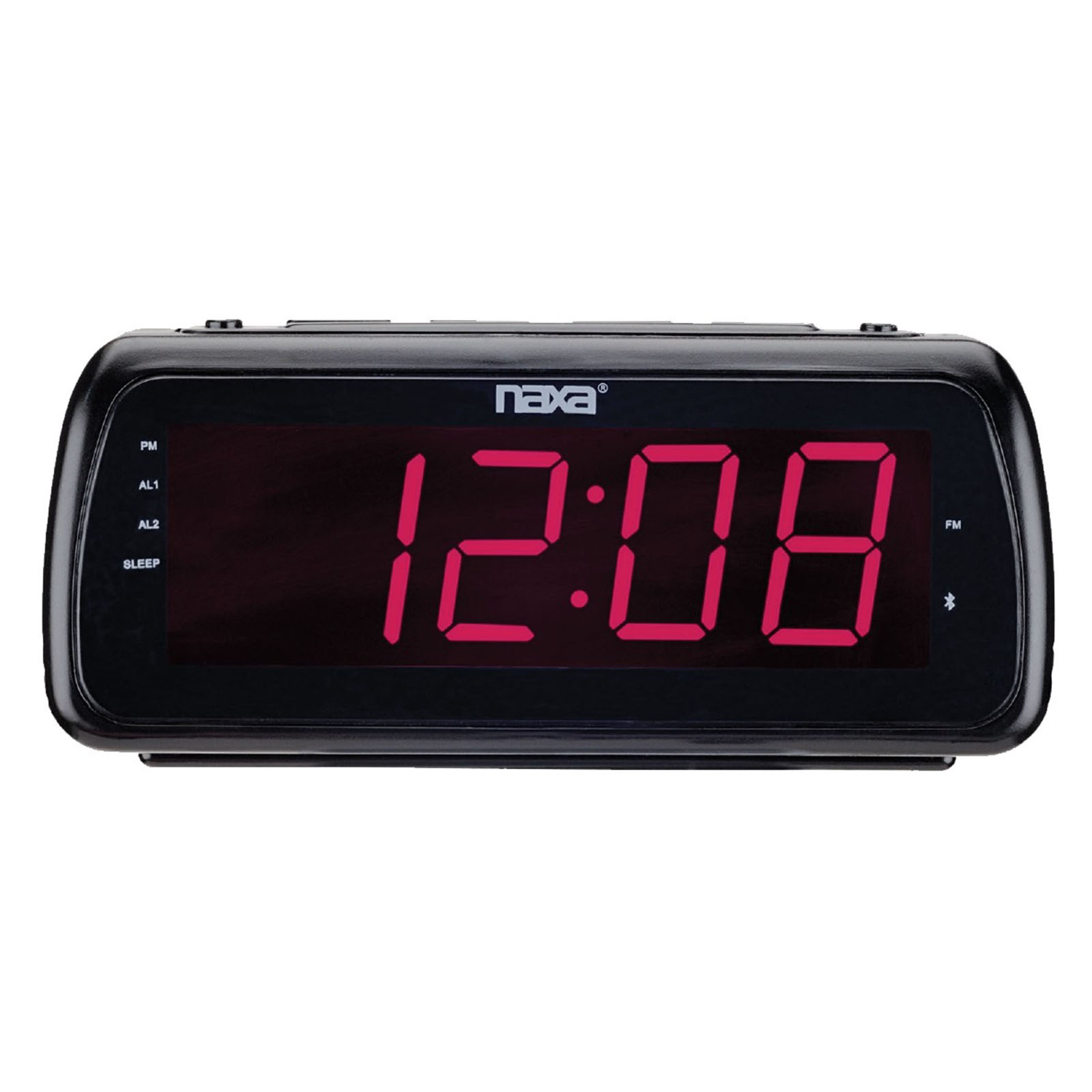 * A dual alarm clock with a jumbo display, digital FM radio, and a handy USB charge port * Jumbo 1.8a high-contrast LED screen * FM radio with digital preset memory * Convenient USB charge port provides power for your cellphone or other mobile device * Two independent alarm timers, snooze, sleep, and wake to radio or buzzer functions * Time\/alarm battery backup * Accessories included: AC power adapter * Power: AC 110\/220V dual voltage, USB charge output, 2 x AAA batteries (clock backup, not included) SPECIFICATIONS * Display Type: LED (1.8 jumbo) * Speaker Type: Mono * Disc Support: -- * Radio Tuner: FM with digital preset tuning * Alarm Clock: Dual timer * Input: Bluetooth v2.1+EDR, 3.5mm AUX audio * USB Charge Port: Yes * Power Source: AC 110\/220V (dual voltage) , USB charge output (5V, 1A) , 2 x AAA batteries (clock backup, not included) * Accessories Included: AC power adapter * UL\/ETL Certification: Yes Item Dimensions: 8.50 x 3.00 x 3.25 Item Weight: 0.63lbs Color: Black.