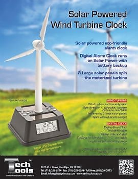 Digital Alarm Clock runs on Solar Power with battery backup 3 Large solar panels store power to spin the motorized turbine Displays date and year.