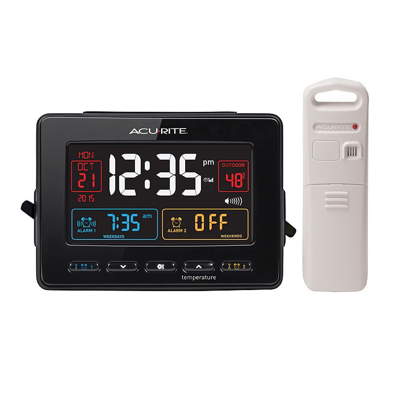 Illuminated color display with outdoor\/indoor temperature, atomic clock and calendar Dual programmable alarms can be set for everyday use, weekdays or weekends Convenient USB charging port for compatible smartphones Radio-controlled to maintain the correct time with split-second precision and automatic updates for Daylight Saving Time Wireless weather-resistant outdoor sensor What's Included Alarm clock Wireless sensor Power adapter 4.3\